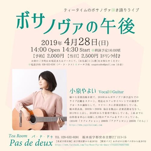 ゴールデンウィークに宇都宮で、ボサノヴァ弾き語りのライブを開催いたします 会場は、宇都宮市文化会館の近くにあるティールーム Pas de deux (パ・ド・ドゥ) です☕ ~ティータイムのボサノヴァ弾き語りライブ~『ボサノヴァの午後』 【日時】2019年4月28日…