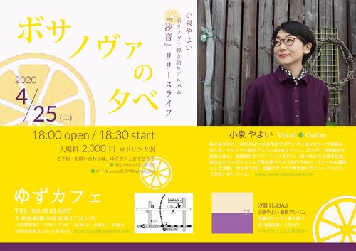 〔2020年4月8日更新〕 新型コロナウィルスの感染が広がり続けている中、4月7日に緊急事態宣言が発令され、千葉県も対象地域となりました。 そのことを考慮いたしまして、2020年4月25日に予定しておりましたゆずカフェさんでのライブは、延期 (時期未定) とさ…