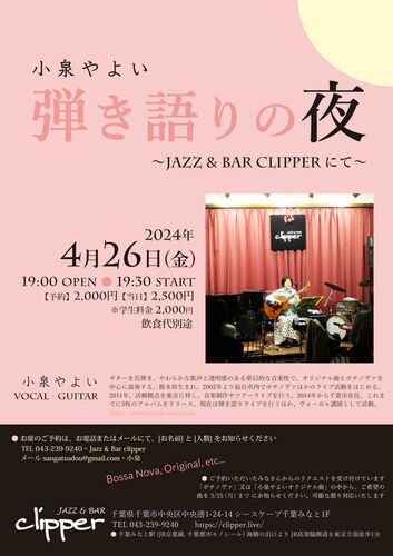4月に千葉みなとで弾き語りライブを行います 小泉やよい 弾き語りの夜 ~Jazz & Bar clipperにて~ 小泉やよい (vo, gt) 2024年4月26日 (金) 千葉みなと Jazz & Bar clipper19:00 open / 19:30 start 【料金】予約 2,000円 / 当日 2,500円 (学生 2,000円) +…
